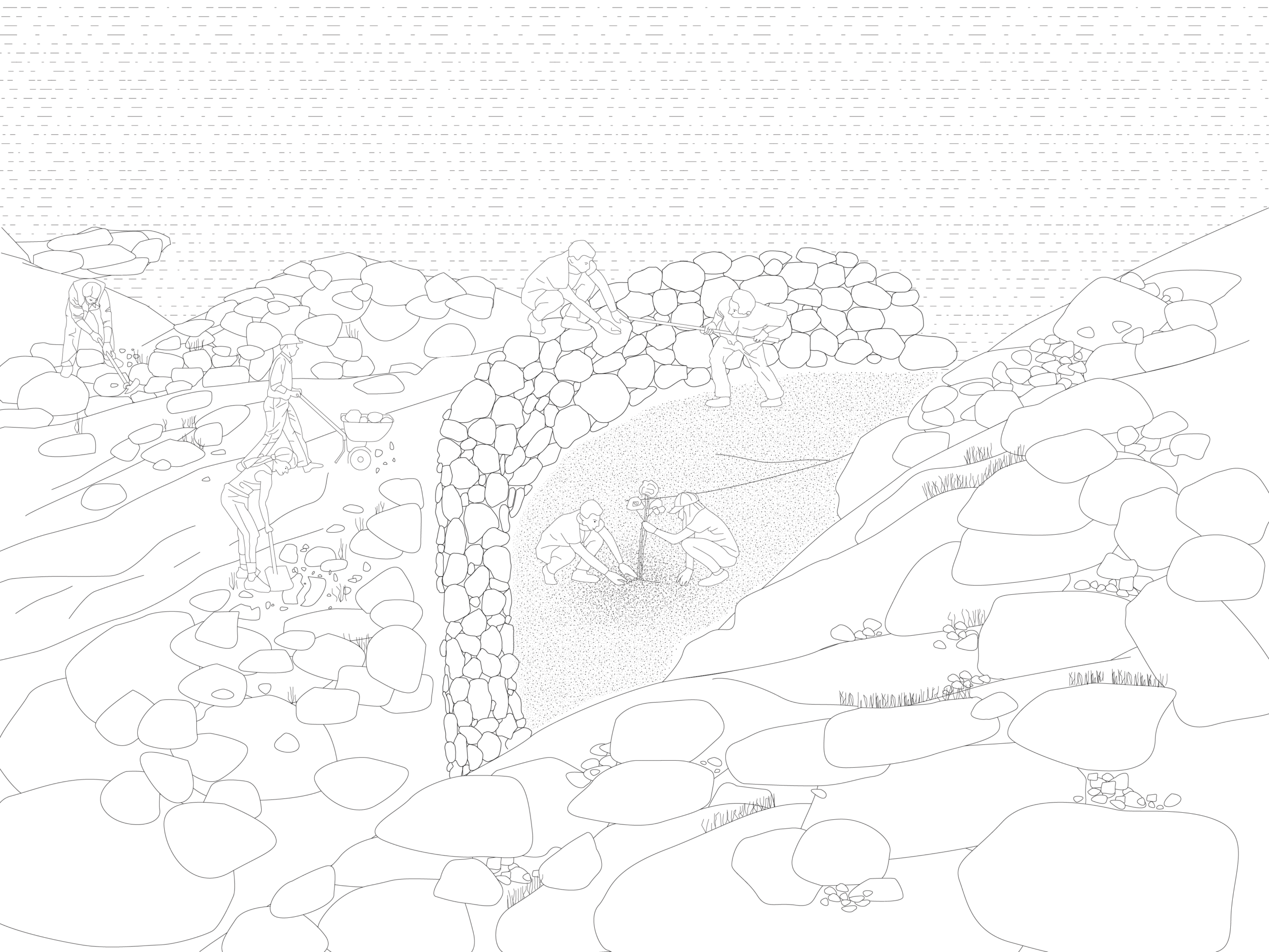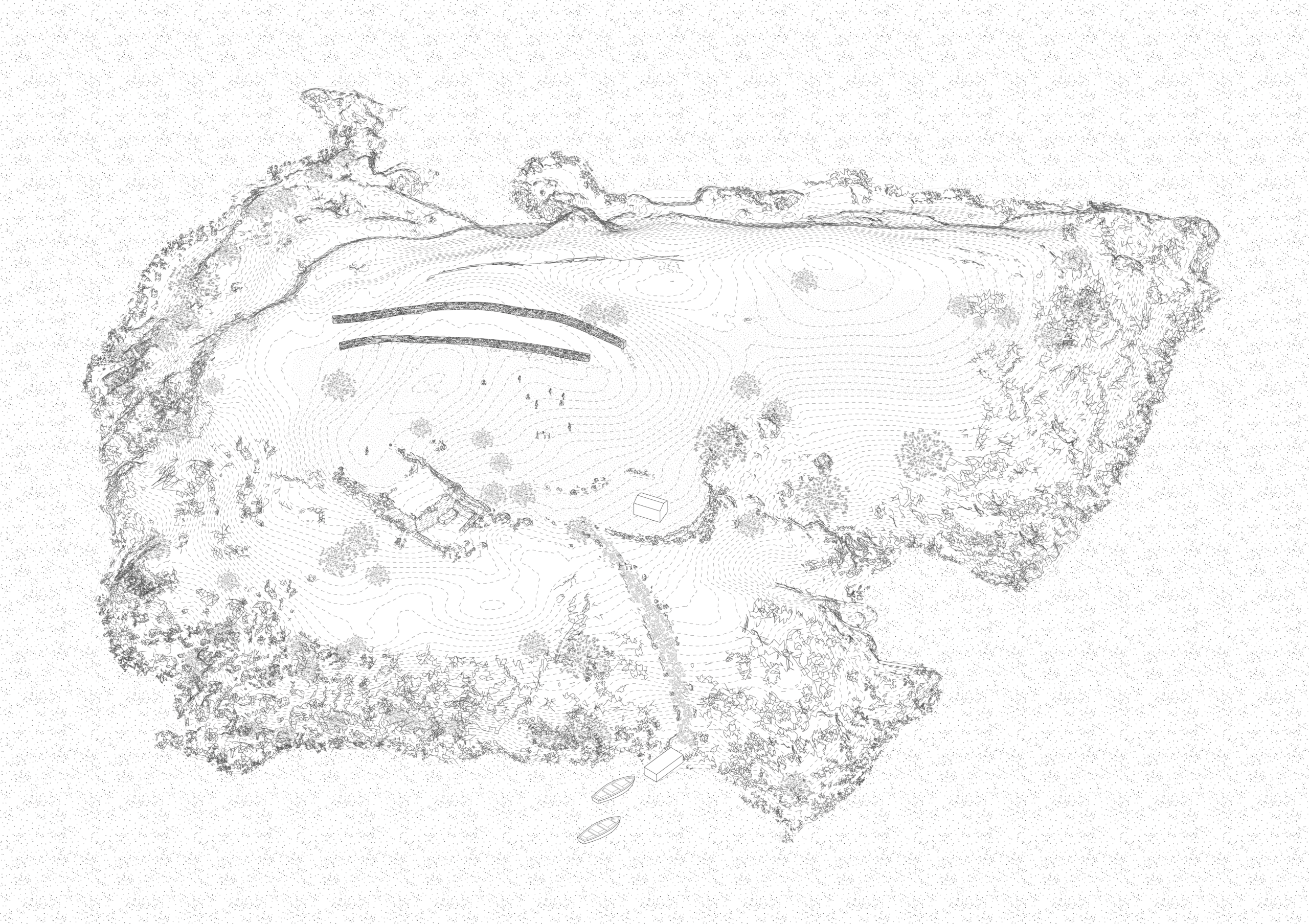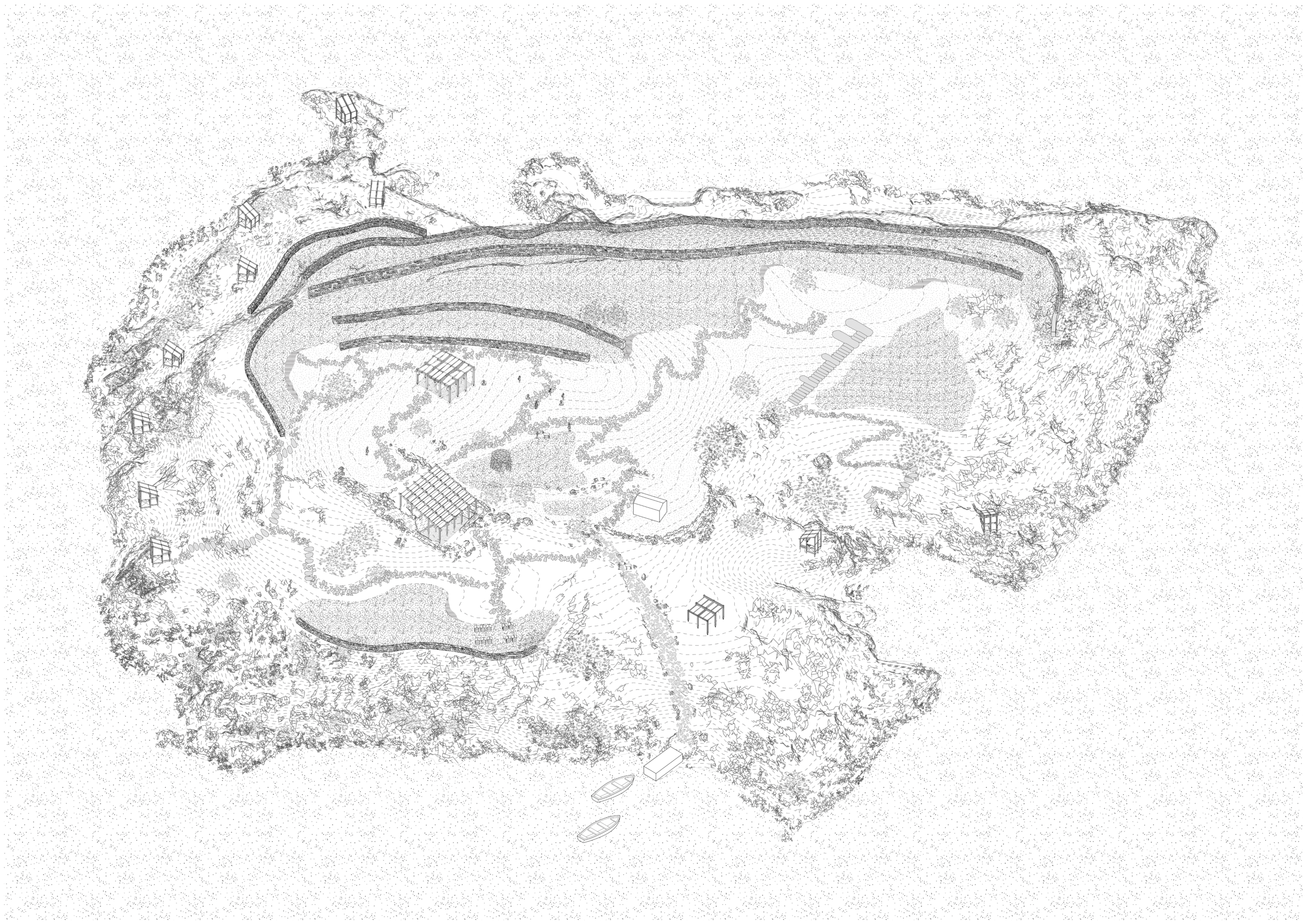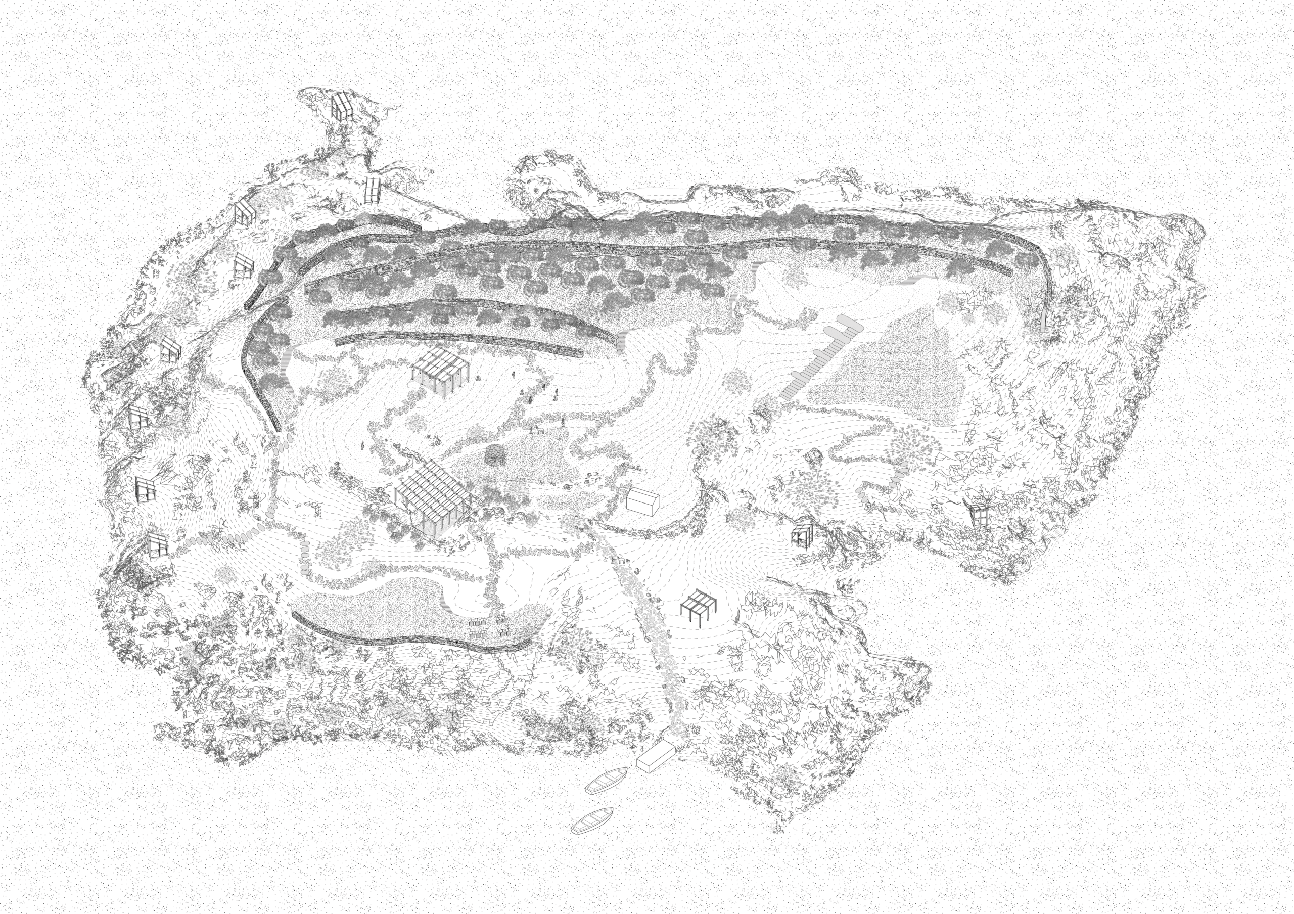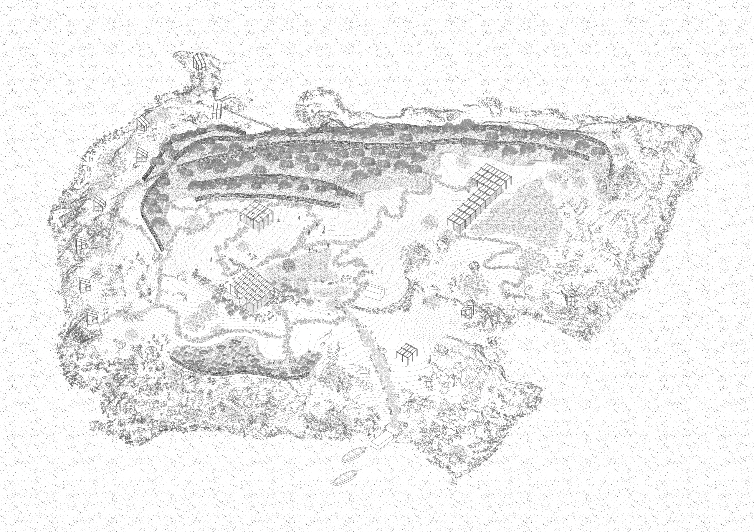 This project treats the island not as a blank slate, but as a fragile, wounded landscape in need of attentive care. Once cultivated by a solitary inhabitant, the island is now largely abandoned, its soil eroded and its agricultural memory fading. At the heart of the restoration effort lies the reconstruction of traditional dry stone walls (ξερολιθιές)—a centuries-old method of shaping and stabilizing steep terrain, which historically protected both ecology and productivity. These walls are not simply infrastructural tools, but carriers of cultural knowledge and resilience.