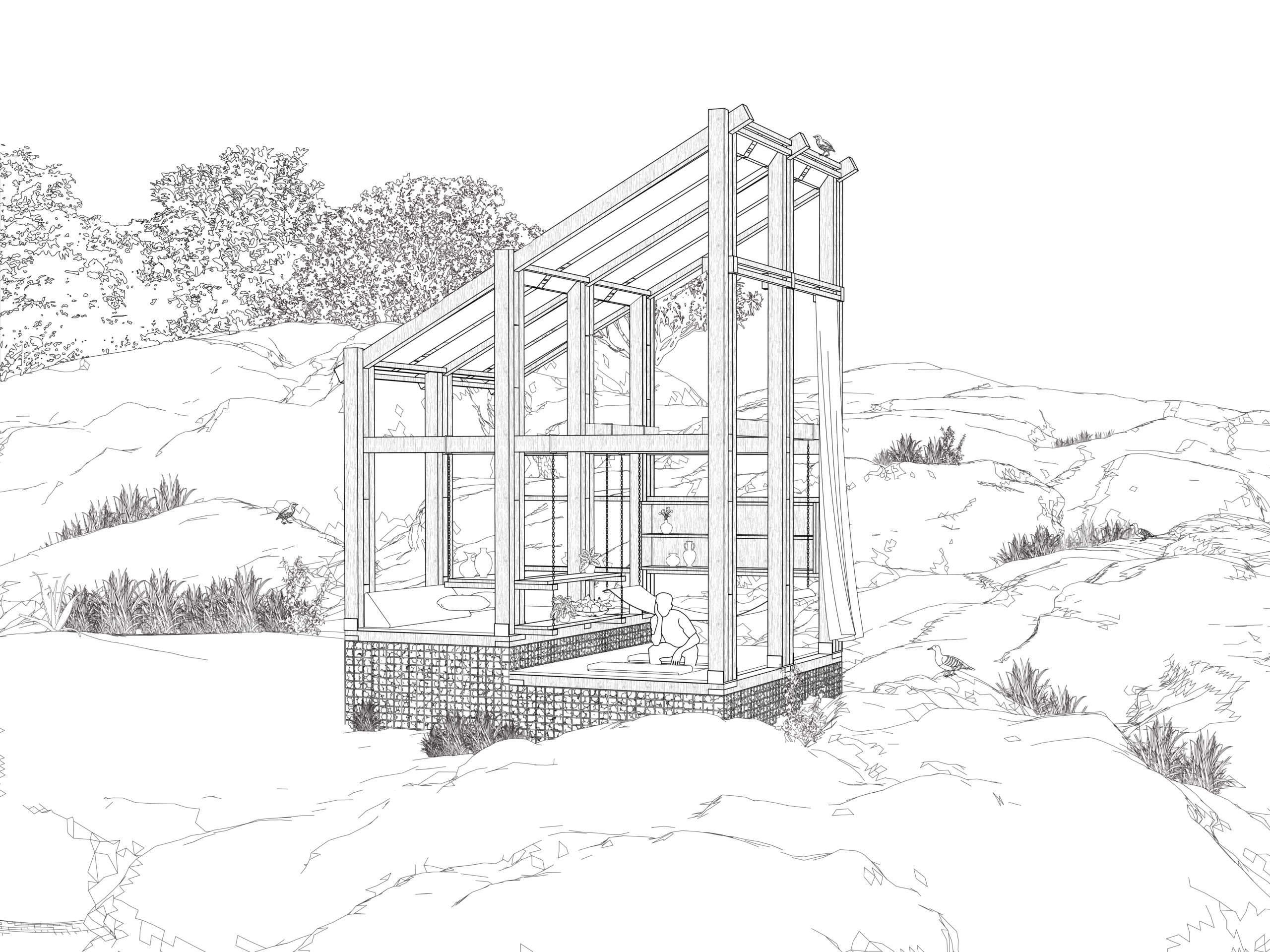 A small group of permanent caretakers, periodically joined by invited guests engaged in permaculture, initiates a continuous cycle of maintenance and cultivation. The island becomes a place of sustained work and shared responsibility, organized by a clear protocol of use and cohabitation—an open and adaptive model for ecological restoration grounded in collective care. Kivotos is understood as a ruined landscape that can be preserved—a terrain marked by the remnants of harsh agricultural labor: dry stone walls, cultivated terraces, and the solitary ruin of its former dwelling. Rather than approaching the island as a site for development, the project reactivates its productive history through the restoration of traditional land-based structures and practices.